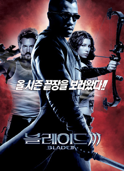 출시연도: 2004년, 감독: 데이비드 S. 고이어. 출연: 웨슬리 스나입스(블레이드역), 크리스 크리스토퍼슨(아이브러햄 휘슬러 역), 아비게일 휘슬러 역의 제시카 비엘, 한니발 왕 역의 라이언 레이놀즈, 다니카 탈로스 역의 파커 포지, 드라큘라, 드레이크 역의 도미닉 퍼셀, 서머필드 역의 나타샤 리온, 개요: 블레이드 영화 시리즈의 세 번째 작품으로, 웨슬리스나입스가 연기한 반 인간 뱀파이어 사냥꾼 블레이드의 이야기입니다.